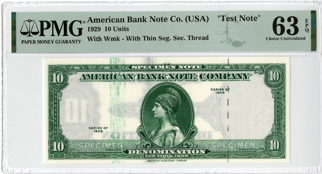Malaysia & U.S. 1929. 10 Units, Specimen Test Note, Green and white, With Tiger watermark used on 1970-1980 Malaysia Banknotes, also with a Thin Segmented Security Thread, PMG graded Choice Uncirculated 63 EPQ with comment "As Made Ink."