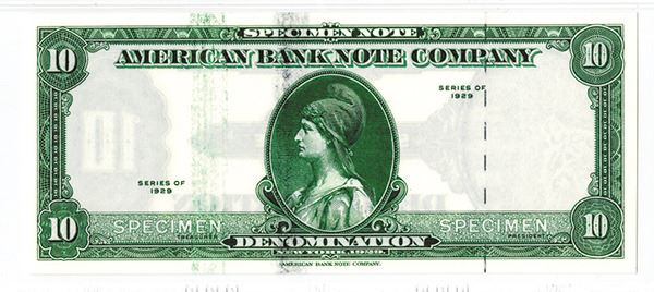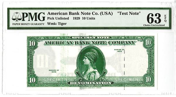 New York, NY. 10 Denomination, Green face, black back, foil security thread at right, Tiger watermark in window at right slightly into border design. PMG graded Choice Uncirculated 63 EPQ. Rare with watermark. ABNC.