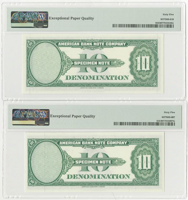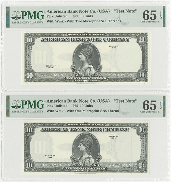 New York, Lot of 2 notes, Both are 10 Denomination, (series of 1929, printed in 1970-80's), ABN Test Note, P-Unlisted, Black printing on white paper on obverse, reverse green, Evidently a watermark and security thread test note for an Estonia banknote, ca. 1970-80's. With castle Watermark used on Estonia notes and micro-thread, PMG graded Gem Uncirculated 65 EPQ., ABNC. (2)