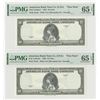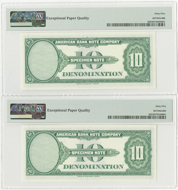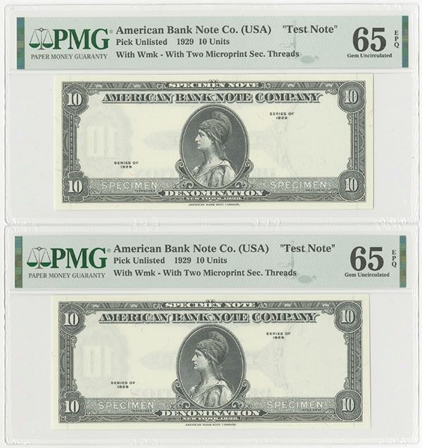 New York, Lot of 2 notes, Both are 10 Denomination, (series of 1929, printed in 1970-80's), ABN Test Note, P-Unlisted, Black printing on white paper on obverse, reverse green, Evidently a watermark and security thread test note for an Estonia banknote, ca. 1970-80's. With castle Watermark used on Estonia notes and micro-thread, PMG graded Gem Uncirculated 65 EPQ., ABNC. (2)