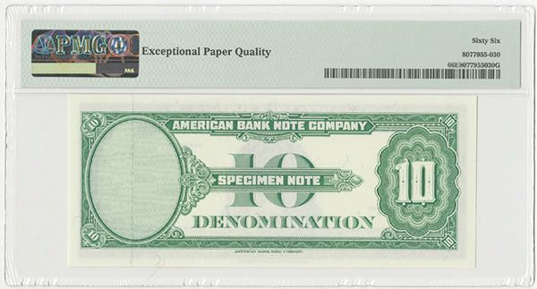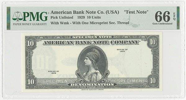 New York, 10 Denom, ABN Test Note, P-Unlisted, Black printing on white paper on obverse, reverse green, Evidently a watermark and security thread test note for an Estonia banknote, ca. 1970-80's. With Watermark and micro-thread, PMG graded Gem Uncirculated 66 EPQ., ABNC.