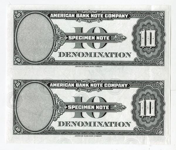 NY. Uncut Vertical Pair of notes. 10 Denomination, P-Unlisted, Black on m/c undertint with circular screaming Eagle Watermark, back black, Printed on Tyvek paper. Large margin at top, one light vertical fold near left margin keeps this pair of notes in choice AU. Rare. ABNC.