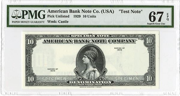 New York and Estonia. 10 Denomination, P-Unlisted, black without underprint, liberty in middle, back green, 2 security threads on left and right with EESTI PANK Security Thread and Castle watermark used on first series of Estonia notes. PMG graded Superb Gem Uncirculated 67 EPQ. Rare sample note.