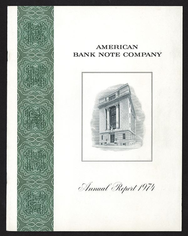 NY. Annual Report, 1974. Features Board Street HQ Building, and scroll left end. 16 pages of news and financial information. Fife and Drum player vignette on bound in page.