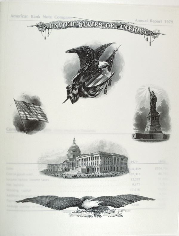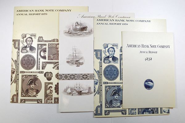 Also includes Interim reports for 3.31.1938, 6.30.1939, 9.30.1940, 9.30.1941, plus a 1973 reprint of a Liberty Bank $100 note, and a ABNC 1983 book on security printing with an intaglio cover with hologram. A nice variety in the group.