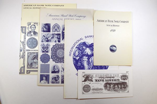 Also includes Interim reports for 3.31.1938, 6.30.1939, 9.30.1940, 9.30.1941, plus Statue of Liberty card celebrating the company's 1986 centennial, a 1973 reprint of a Liberty Bank $100 note, and the Animal Kingdom sheet. Finally an International BNC Annual Report for 1981. A nice variety in the group.