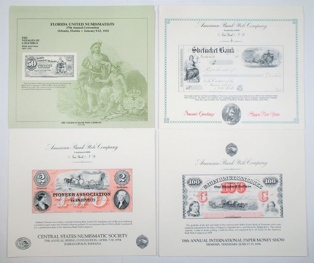 New York, Indiana, Cuba, and Tennessee. Lot of 20 Souvenir Cards, Including Shetucket Bank "Season's Greetings" Bank Draft with Santa Claus Vignette(5); Indiana, Central States Numismatic Society, Pioneer Association, $2 Obsolete Note printed in red and black (5); 1889 (Reprinted in 1992), Florida, Florida United Numismatists, Banco Espanol de la Habana, 50 Centavo Note featuring Voyage of Columbus (5); and, 1994, Memphis, Tennessee, Annual International Paper Money Show, Union Bank of Tennessee, $100 Obsolete Note (5). The cards are in CU condition as printed. (20 pieces total). Sold "AS IS" no returns accepted.