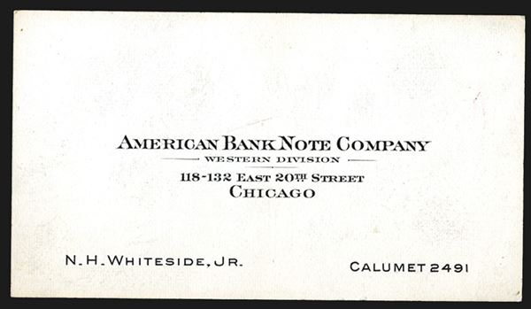 IL. American Bank Note Co. Business Card for N.H. Whiteside, Jr. Chicago office. 1945 calendar on back. Both sides are intaglio. Slightly dirty. Very Fine +.
