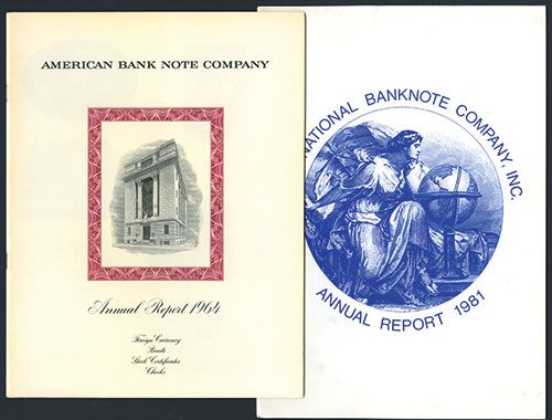 ABNC Annual Reports from 1964, 1965, 1968, 1969, 1971, 1973-81, 1992-94 some with Intaglio printed vignettes, 1980 & 1981 Annual Reports for Bradbury, Wilkinson and Company Ltd., Annual Reports for International Banknote Co. for 1981, 1983 and 1985. VF condition lot.