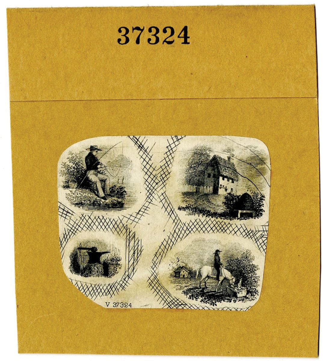 New York, NY. Early proof vignette consisting of 4 different smaller vignettes on 1 printing plate separated by cross hatching. With images of a man fishing, a house, a horse eating, and, an ironsmith's anvil, Printed on India paper in black and mounted on thin manila file card, die/file number V37324. Uncirculated. Use on early obsolete banknotes, fiscal documents and other printed items. Printed by an early ABNC predecessor company.