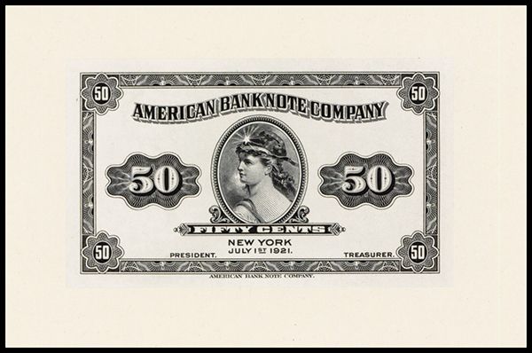 American Bank Note Co. Proof 50 cents Ad Note 1921. New York, 1921, 50 cents, Liberty with star facing left in middle, Printed in black on india on large card, Choice Uncirculated condition. ABNC.