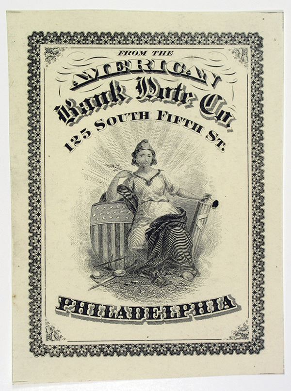 Philadelphia, Pennsylvania, ca.1860-1870's ABNC Proof Intaglio printed Ad Label, with the address of the Philadelphia office, 125 South Fifth Street, Black text, Intaglio, printed on india paper, 3x4 inches. Seated allegorical Liberty next to American shield at center, VF condition with a black stain at center right. Rare label and first time seen by cataloger. ABNC.