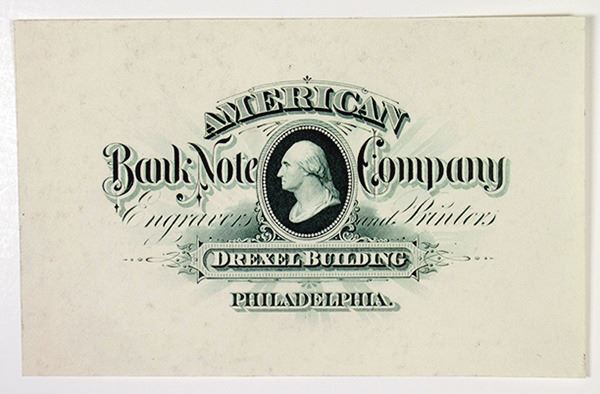 Philadelphia, Pennsylvania, ca.1885, ABNC Proof Philadelphia business card. Green text, Intaglio, and printed on thin bond type of paper, 4.5x3 inches. Bust of George Washington at center, above ornate 'Drexel Building' text, XF condition. The Drexel building originally stood at the S.E. corner of Fifth and Chestnut Streets in Old City Philadelphia, it was built in 1885 and served as an office for the American Bank Note Company. It was demolished in 1955 and is a park today. ABNC.
