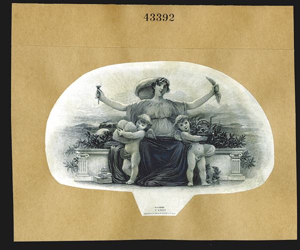 Die Reference folder proof. Female seated with two angelic figures holding cotton bale and produce. Steam train in distance at left, factory at right. V48392. Mounted to cut fragment of old folder. ABNC.