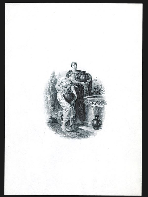 Two females at well with water jugs. Intaglio, 5x7 on paper. As made.