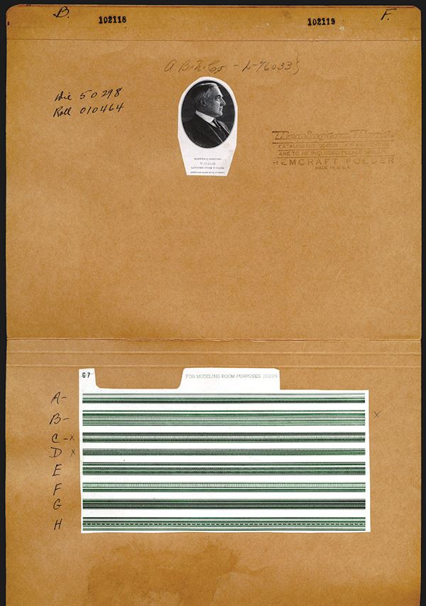 Die Reference folder proof. Warren G. Harding. Profile right in oval. V102118. On the same folder is a sheet with eight different linear borders, #102119. ABNC.