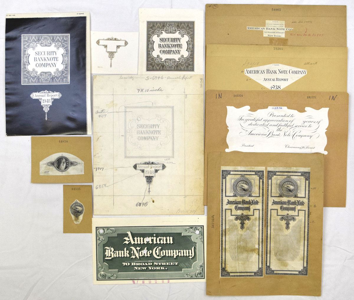 New York, 1938-48. Lot of 11 security printing production and design items from American Bank Note Co. and Security Banknote Co., New York, Includes: Security Banknote Co. Annual Report cover, mounted square cover proof, and a large annotated layout sheet for the 1948 report with printer’s measurements and internal notations, two small mounted engraved die proofs (portrait and seal elements), a mounted ornamental engraving element, and three large American Bank Note Co. mounted layouts including a 1938 Annual Report cover and a presentation certificate design, mounted pair of vertical cover layout proofs and a large American Bank Note Co., 70 Broad Street, New York imprint card. Several pieces retain original job numbers, paste-ups, and production markings typical of internal security printing files. Condition ranges from VF to XF with toning, handling wear, and adhesive remnants consistent with printer’s archive material. (11). Sold "AS IS" no returns accepted.