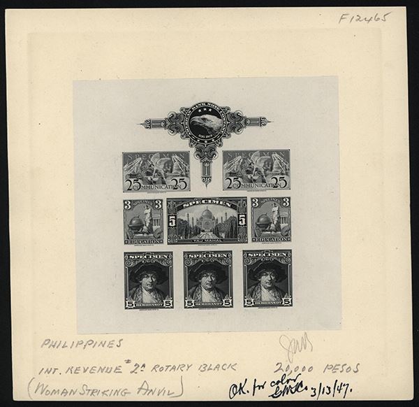 Scott Unlisted. 1947. Large Die Proof of 8 different stamps in sheet form. Designs include "25 Communication" (2); "3 Education" (2); 5 Taj Mahal (1); "5 Rembrandt" (3). All are in "Rotary Black " color. ABNC eagle logo on top. Printed on white india paper on large cream card 8 x 8 inches. Text on bottom states Philippines - Int. Revenue #2A Rotary Black - 20,000 Pesos (Woman Striking Anvil) OK for Color 3/13/47 with approval initials. Back has purple Approval stamp with time and date. ABNC. Choice condition. Unique color approval proof for Philippine Revenue stamp.