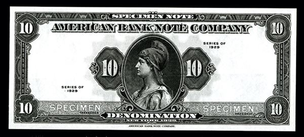 New York, 10 Denomination, Tyvek banknote. Experimental Tyvek note. Black printing without underprint, Liberty in middle, back green. PMG graded About Uncirculated 55, Rare Tyvek item.