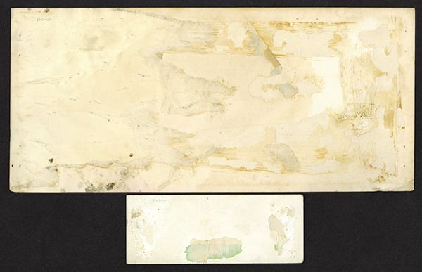 ABNC sign is brown-black and 5-1/2x 2-1/4. The Crane & Co. sign is 12-1/2 x 5-3/4 with views of the Pioneer Mill and the Government Mill buildings at bottom center. Light edge chipping on each. Card stock, both formerly mounted. 2 pieces.