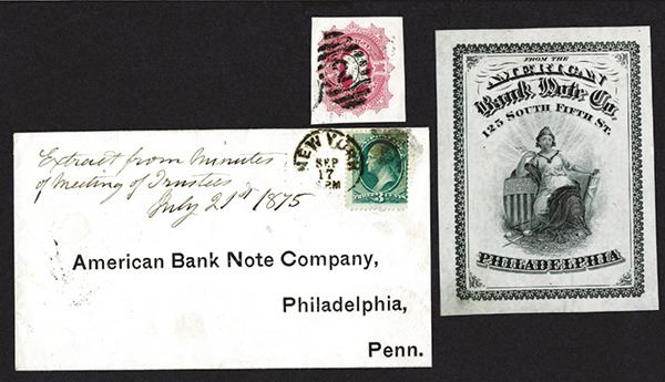 PA. Lot of 3 items, Includes Label from ABNC, 125 South Fifth St., Phila., Black on white, 3 by 4 inches, seated allegorical Liberty in middle, VF; 1875 stamped envelope addressed to American Bank Note Co., with notation on top "Extract from minutes of meeting of Trustees, July 21, 1875, VF; and American Bank Note Co. embossed postal stationary in red with portrait in middle and postal cancellation, this was a sample or specimen of the types of postal stationary ABNC can produce. Scarce group.