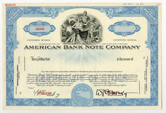 New York, ca. 1940-50s. >100 Shares Specimen Stock Certificate, Black text with light blue border and underprint, Pair of allegorical figures at top center. Red specimen overprints, 00000 serial number, and POCs. VF condition, ABNC.