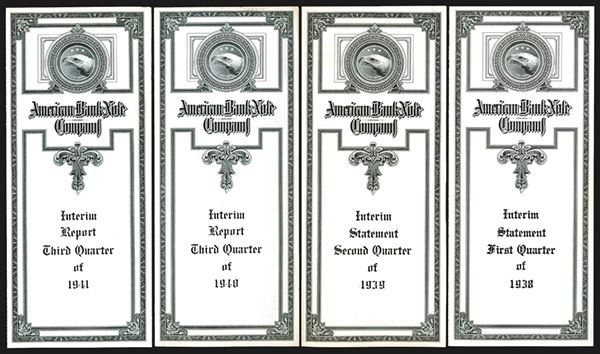NY. American Bank Note Co. Interim Statement cards. First Quarter 1938; Second Quarter 1940; Third Quarter 1940; Third Quarter 1941. Letterpress interior, intaglio cover with eagle head. One 1940 slightly dirty at top. 4 pieces.