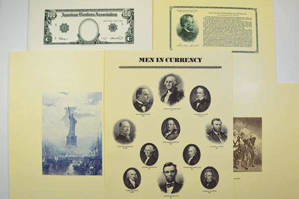 NY. Sample booklet made for the 1975 American Bankers Association. Features three pages of vignette pages - Men in Currency, Statue of Liberty, Gettysburg Address and Colonial Drums and Fifes. As made.