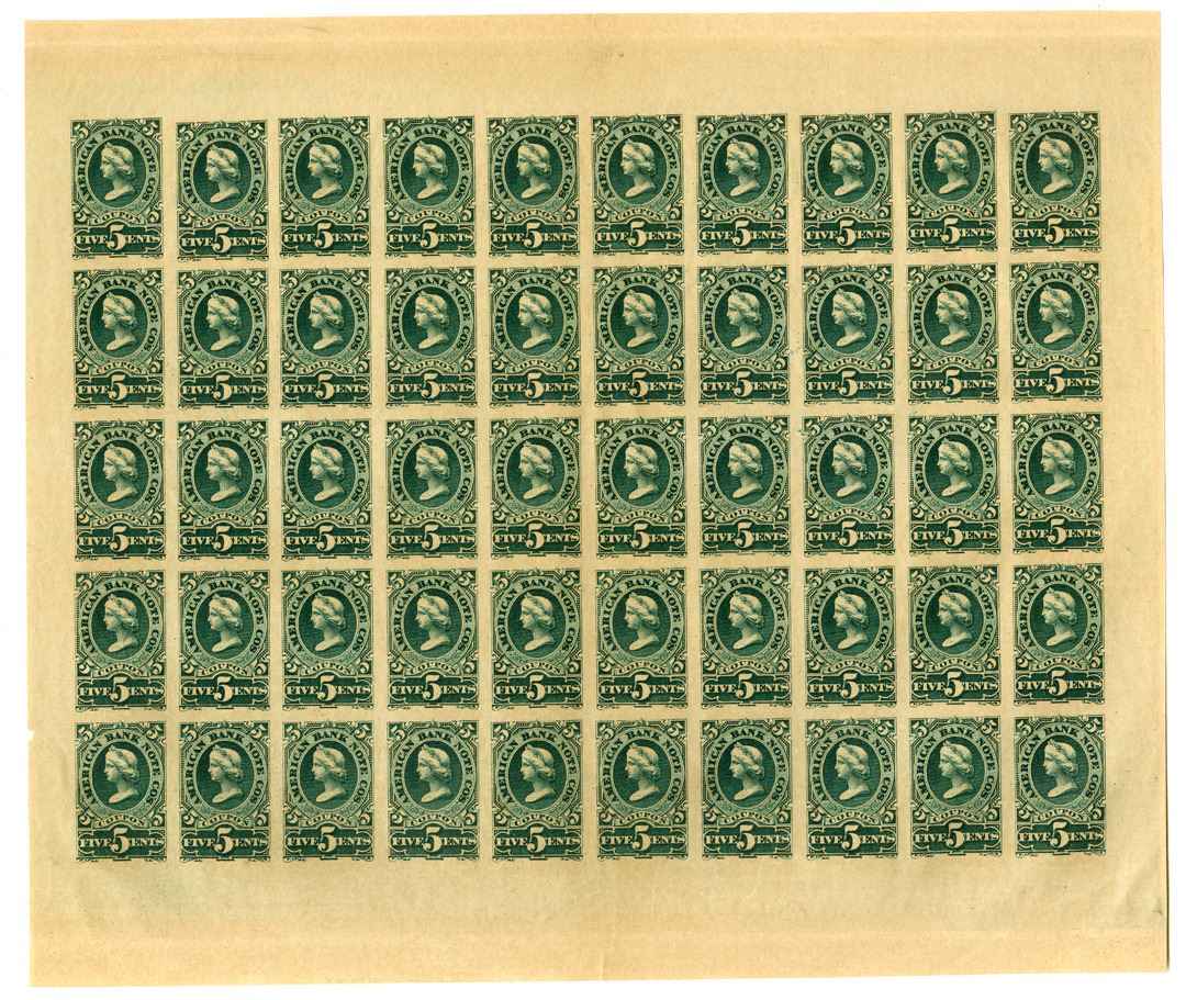 NY. ABNC 1862 uncut Sheet or 50 revenue essay Plate proof stamps, printed on ungummed paper, Design of Liberty Head on bluish green on wove paper, Imperforate, Turner 2-Fb var. Mint condition. (1 sheet of 50 stamps). ABNC.