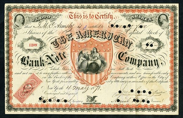 New York, May 4th, 1871, 75 Shares, Issued and punch cancelled, Black on red and black border and underprint with Franklin and Washington on upper left and right corners, Seated allegorical Liberty with eagle and flag superimposed over U.S. Shield under ornate curved title, 25 cents U.S.I.R. adhesive stamp on lower left, S/N 1209, Issued to J.M.C. Armsby and signed by John Gavit as president, Wright as treasurer and Freeland as Secretary. VF condition. ABNC.