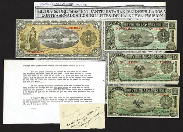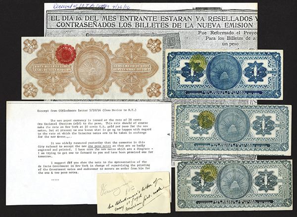 Mexico, 1915, 1 Peso, P-S709 (3 examples); 1 Peso Vera Cruz P-S1101a. With an old photocopy of a newspaper article and a typed translation of a 1916 letter as well as a manuscript notation. Notes are VF-EF some with paper loss. Paper clip impression (but no rust) on latter. 4 pieces. Correspondence from ABNC research and production department.
