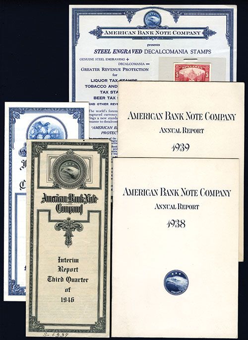 Lot of 5 items, Includes 1938 & 1939, ABNC Annual Reports; Quarterly Reports for ABNC (1946) and IBNC (1982); Advertisement for Steel Engraved Decalcomania Stamps with red specimen stamp with Taj Mahal on upper right corner. VF condition, interesting security printing ephemera.