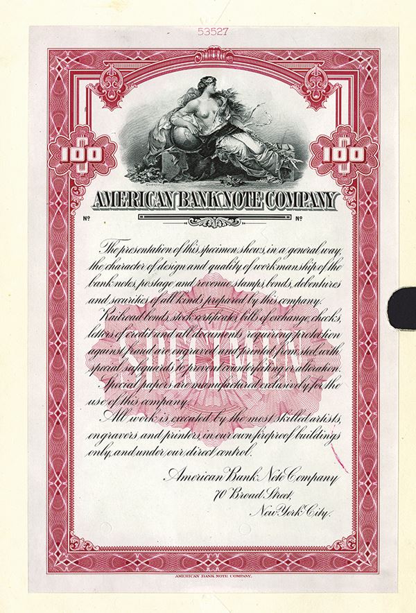 70 Broad Street, New York. 126 x193mm, red border, magnificent semi-nude allegorical female reclines against a globe. Printed on bond paper mounted on card. The engraved text communicates the high level of workmanship and security inherent in ABNC products. Uncirculated, with a small piece out of the card at top left, and a notch in the right side of the card, indicating this example was executed as part of the proofing process. Mounting stains on the back of the card.