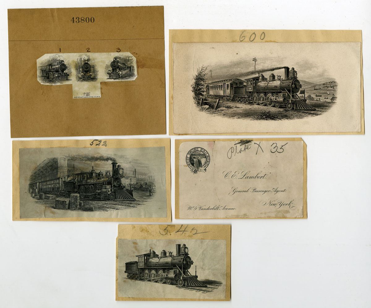 Lot of 5 Proof Vignettes of trains and train related business card. Vignettes are printed on India paper and mounted on cardstock or manilla paper, and range from Fine to XF condition. (5). Sold "AS IS" no returns accepted.