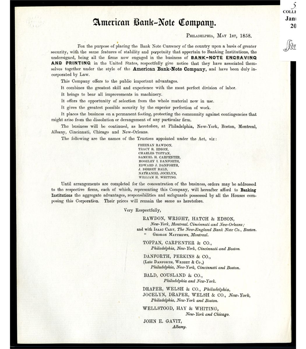 Philadelphia, Pennsylvania, 1858, Uniface. Small quarto. 215mm by 262mm, printed on English paper, XF to AU condition, Lists all the principals of the new company as well as the company names on the bottom, In the original holder from the "52 Collection".