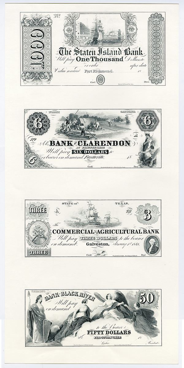 NY and Philadelphia. 1994, Uncut sheet of 4 different obsolete notes used on Souvenir Cards and from the 1990's ABN Obsolete Banknote Series. Includes NY., $1000, Staten Island Bank, 1840-50's; NC., $6, Bank of Clarendon, 1850's; TX, $3, Commercial and Agricultural Bank, 1848; and, Vermont, 1840-50, $50. Bank of Black River. All have ABN Attestation that they were printed by ABNC in 1994. All are in Gem Uncirculated condition as made. ABNC.