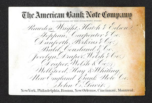 New York. Philadelphia. Boston. New Orleans. Cincinnati, Montreal. Locations listed on card as well as all of the firms that made up ABNC which was formed 1858-59 of 9 different security engravers. Very possibly one of the first ABNC business cards. XF condition with toning on the right and mounting remnants on the back, Rare and first time seen by cataloger. ABNC. Recent discovery from an old New York estate.