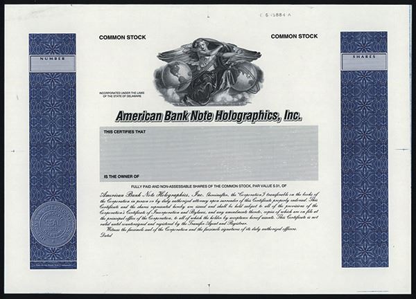 Delaware. Odd Shares Common Stock Specimen Proof Certificate. Black print with blue border. Vignette of an allegorical female between two globes, wrapped in telegraph wires. XF condition, ABNC.