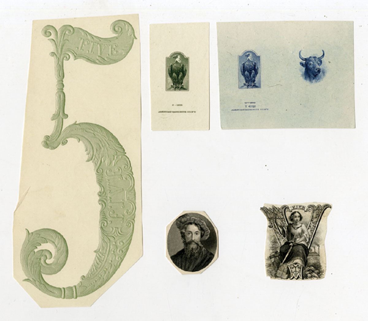 New York and Philadelphia. 1850-1930s, Lot of 5 Vignettes used on Banknotes, Stocks, Bonds, Letterhead and other documents, Vignettes are in AU to UNC condition, 2 are printed on thin white card and cut down to size, the balance are on india paper that is not mounted. (5).