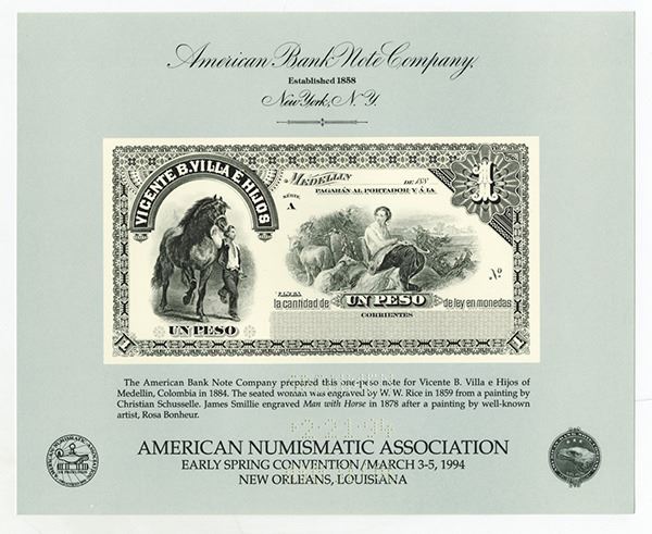 Colombia Intaglio printed proof face from 1 Pesos, Vicente B. Villa E Hijos, 1880s issue banknote reprinted on ANA 1994 New Orleans souvenir card, Pin-punch Specimen with date on bottom, rare as specimen card. Gem Unc., ABNC.