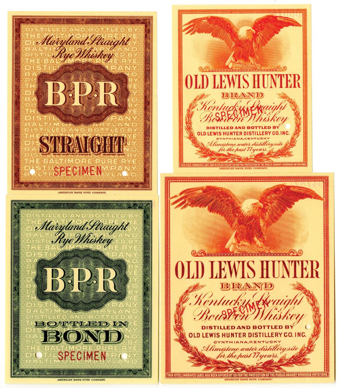 Baltimore, Maryland and Cynthiana, Kentucky, Lot of 4 Specimen bottle labels by ABNC: Includes a Pair of Old Lewis Hunter Brand Kentucky Straight Bourbon Whiskey, one 4 x 4.5 inches, the other 3 x 4 inches, both in red; Pair of B.P.R. Maryland Straight Rye Whiskey, both 3.5 x 4 inches, one in green 'Bottled in Bond', the other brown 'Straight.' All have red specimen overprints and POCs. All Unc. 4 pieces.