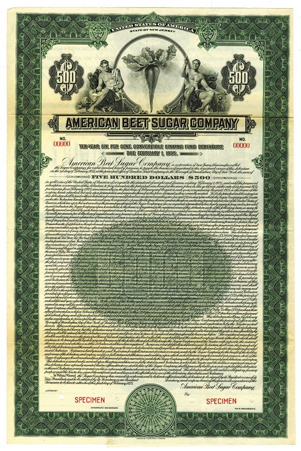 New Jersey. $500 Specimen Ten Year 6% Convertible Sinking Fund Debenture Coupon Bond, Black print on green border an under tint, Allegorical men at top flanking beet at top. Specimen overprints and POC's, VF-XF condition, ABNC. The American Beet Sugar Company, owned by the Oxnard family and based in Denver, was one of the first sugar beet producers, having been formed in 1899. Through the early decades of the 20th century, American Beet developed into a six-plant operation over three states: Colorado, California, and Nebraska.