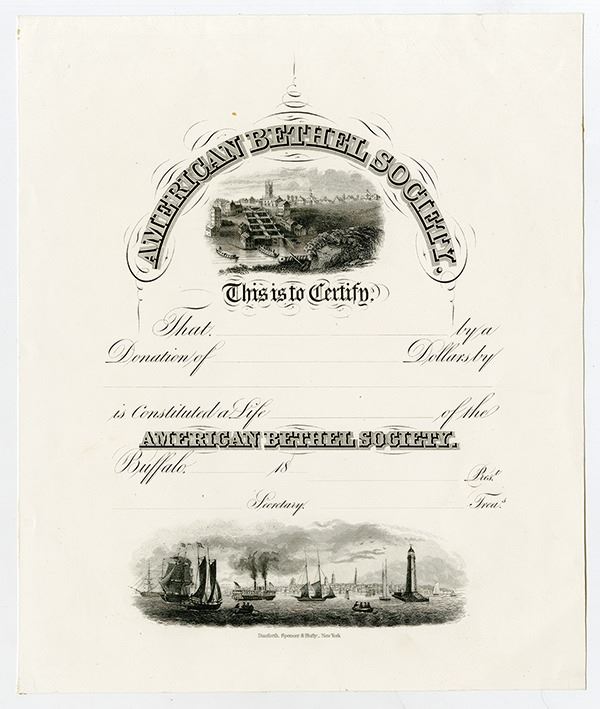 Buffalo, New York. Large certificate featuring two vignettes, top with view of city, bottom with harbor and sailing ships, part intaglio and part litho, printed by Danforth, Spencer & Hufty.