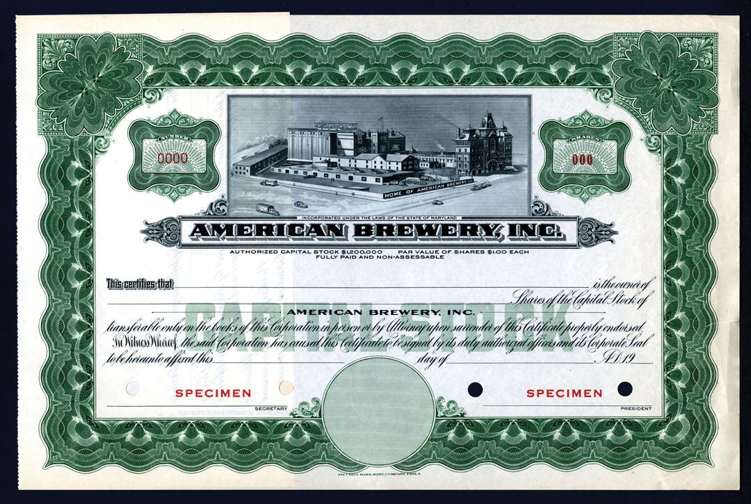 Maryland. 19xx (ca.1900-10). Odd Shs. Specimen stock certificate. Vignette of brewery. Green Border and underprint, ornate vignette of brewery building. "Specimen" overprint. VF-XF condition. Scarce brewery certificate. SBNC.