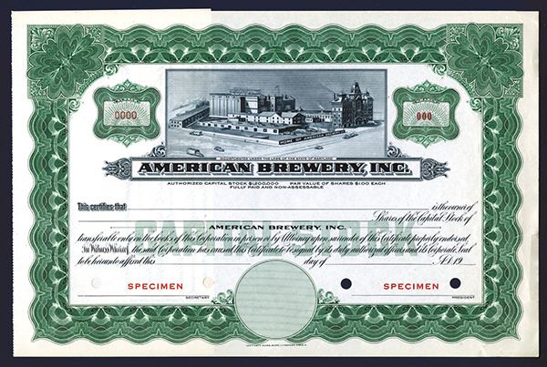 MD. 19xx (ca.1920's). Odd Shs. Specimen stock certificate. Vignette of brewery. Green Border and underprint, ornate vignette of brewery building. "Specimen" overprint. VF-XF condition. Scarce brewery certificate. SBNC.