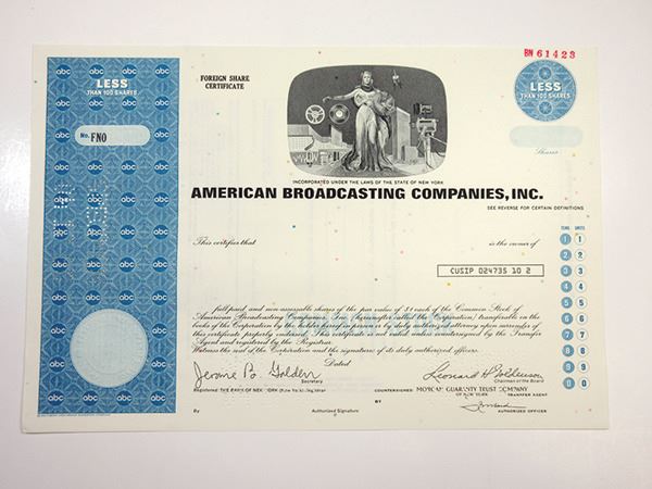 New York. <100 Shares Common Stock Foreign Share Specimen Certificate, Black print on blue border and under tint, Allegorical woman in front of tv studio at top, Pin punched Specimen, VF-XF condition, S-CBNC.