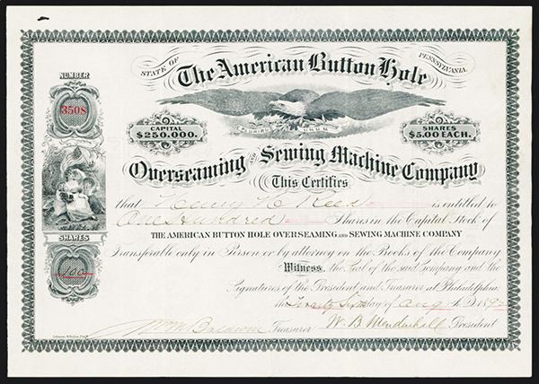 Pennsylvania, 1892, 100 Shares, #3508, I/U stock certificate, Black border with Eagle top center and Woman and Children holding Flag on the left vignette, XF condition.
