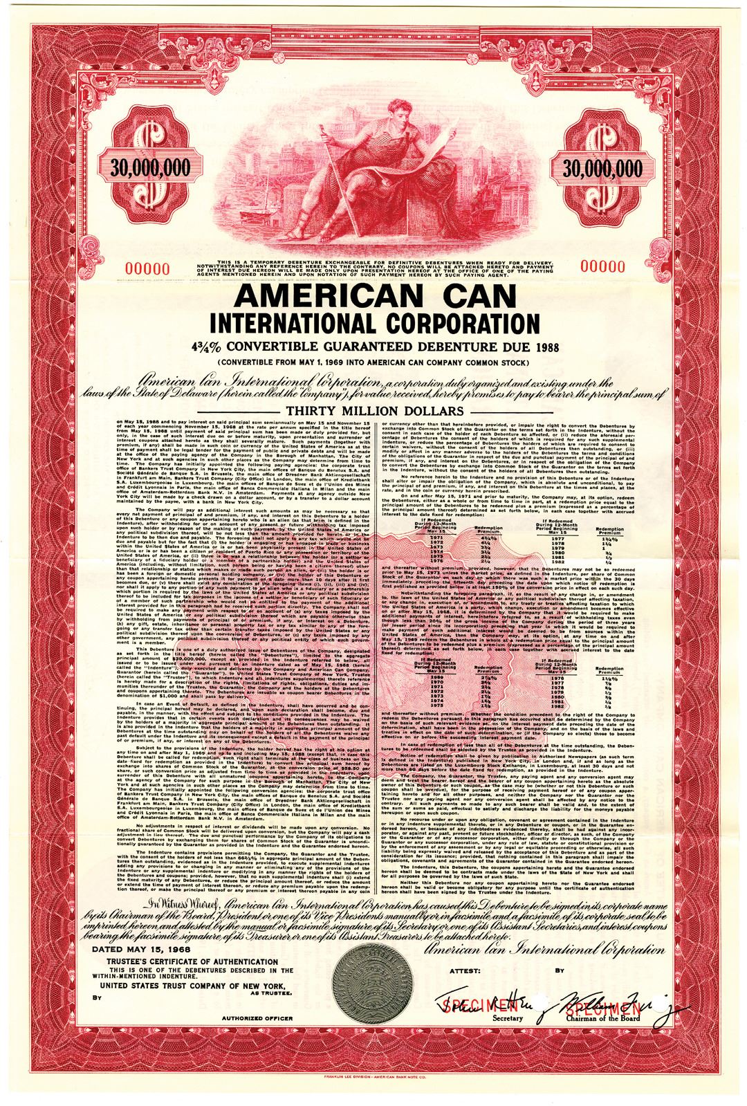 Delaware, 1968. $30,000,000 Specimen 4.75% Convertible Guaranteed Debenture Bond, Black text with red-pink border and undertint, Man reclining while reading at top center. Red specimen overprints, 00000 serial numbers, and POCs. VF condition, ABNC. Rare high denomination bond.