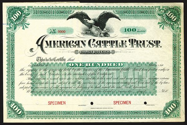 100 Shares, Green border. Eagle vignette. Modeled largely after the Standard Oil Trust. The concept and purpose of the Cattle Trust by Eastern capitalists was to organize and control the western cattle market, erase range and water rights and monopolize the cattle industry and wipe out the independent cattlemen. Due to internal squabbling at every level of the company, it fell apart and went bankrupt in 1890. Historic certificate of a dark and ugly period of the western cattle and cattle ranching industry. Red specimen overprints. VF condition with light toning of paper. Rare.