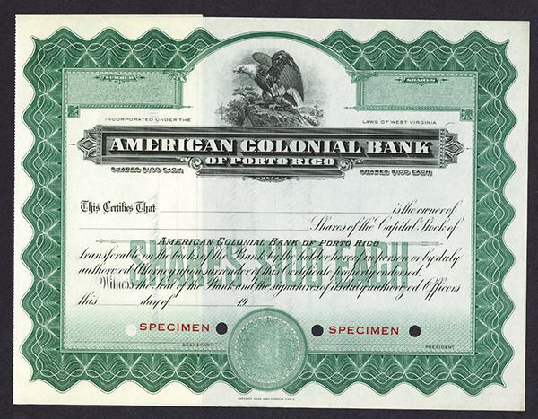 Puerto Rico. ND (ca.1900-1920). Specimen stock. Odd shs. Green border and undertint, eagle vignette. Red Specimen overprint. Rare and early Puerto Rico banking stock. VF. SBNC.